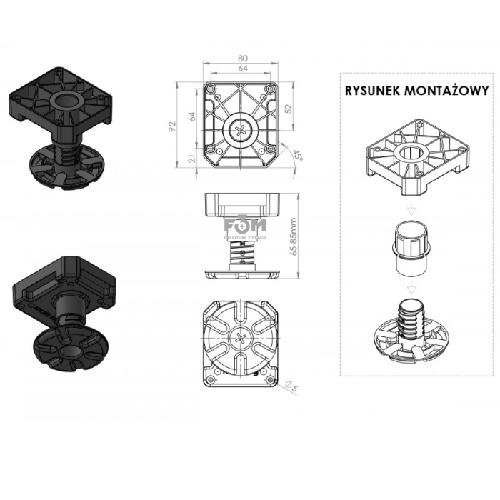 Ніжка регульована Bi-Plast MULTI LEG: нижня опорна частина (з цифровою розміткою для зручності регулювання висоти) + середня стійка + верхній монтажний майданчик H=65-85 мм, матеріал пластик, колір чорний, навантаження до 450 кг на одну ніжку. Ніжка регульована Bi-Plast MULTI LEG – меблева опора для надійної установки важких конструкцій, таких як широкі кухонні секції, обладнані сучасними висувними механізмами підвищеної міцності або багатофункціональні шафи, призначені для зберігання різних речей, що мають значну вагу. Ніжка MULTI LEG виготовлена із надміцного пластику стійкого до механічних, хімічних та інших шкідливих впливів. Використання інноваційних конструктивних рішень дозволяє виробляти меблеві ніжки, які здатні витримати навантаження до 450 кг кожна окремо. Складається із трьох частин. Верхня частина кріпиться безпосередньо на дно меблів, нижня – виготовлена у вигляді гвинта з основою, за допомогою якого регулюється необхідна висота. Подібна конструкція дозволяє ідеально виставити всі елементи меблевого гарнітура незалежно від рівня поверхні підлоги. Допустиме регулювання: +20мм. Для встановлення цоколя до ніжок Bi-Plast MULTI LEG передбачені монтажні кліпси. Щоб спростити процес регулювання висоти ніжки, виробник випускає особливі ключі. Всі супутні елементи до ніжок MULTI LEG можна придбати у нашому Інтернет-магазині. Компанія Bi-Plast є провідним польським виробником пластикової меблевої фурнітури, що відповідає європейським стандартам з якості, безпеки та гарантії довгострокової експлуатації.