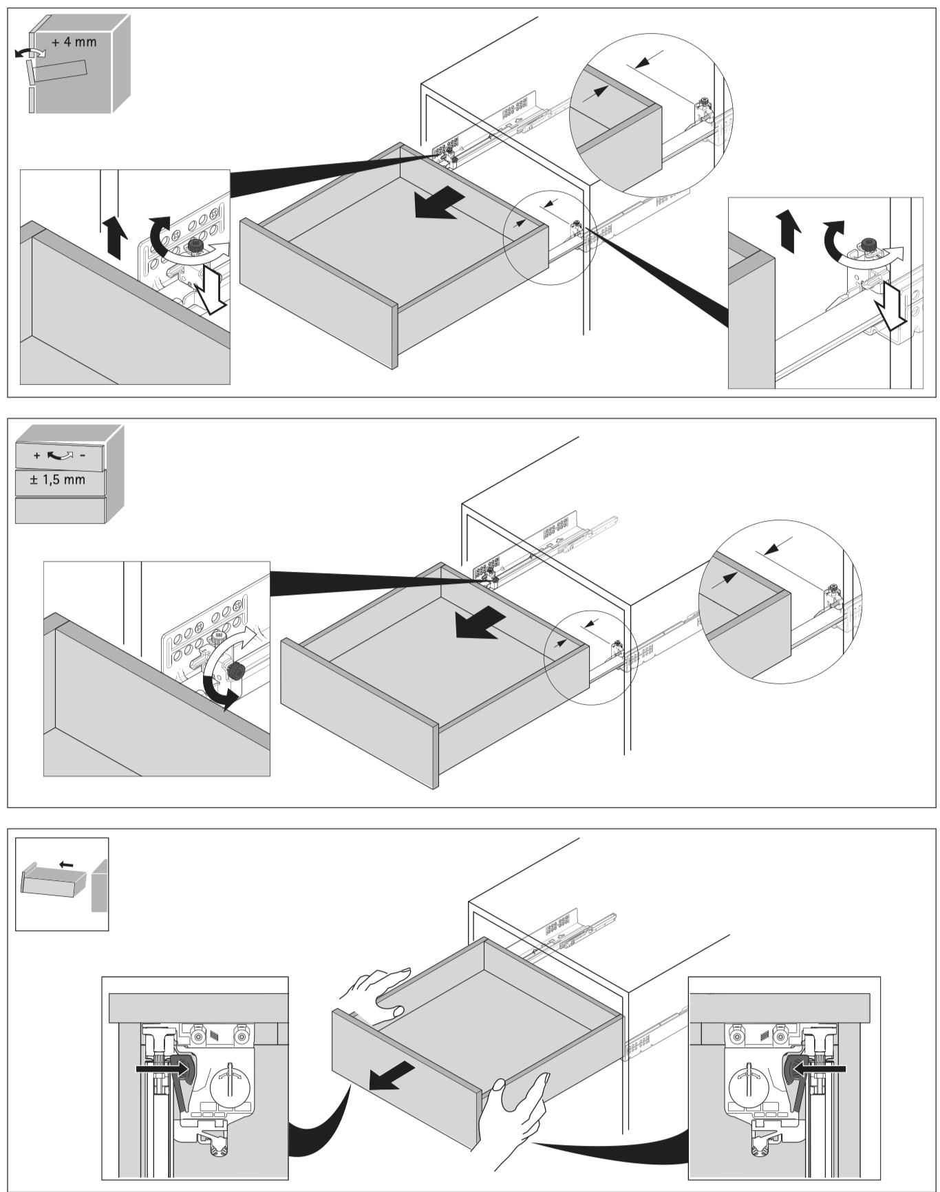 Quadro 5D — це високоякісні меблеві напрямні з інтегрованою системою Silent System, які забезпечують безшумне закривання, точне регулювання у п’яти площинах без інструментів та простий насувний монтаж. Підтримують опціональні функції Push to open Silent, синхронізацію та аксесуари для висувних полиць. Працюють на єдиній платформі з сумісністю до Actro 5D.