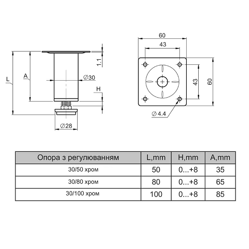 Ніжка регульов. циліндр. 30/80, хром