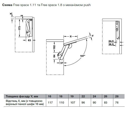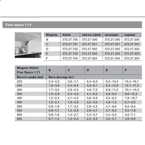 Опис Підйомний механізм меблевих фасадів Free Space 1.11 модель F сірий 37227504 Область застосування: Для дерев'яних фасадів або фасадів з алюмінієвою рамою, шириною не менше 45 мм. Підйомний механізм стандартного відкривання для односекційних фасадів з ручкою і висотою до 650 мм. Матеріал: Корпус - пластик, підйомні важелі і механізм кріплення фасаду - сталь. Висота корпусу: від 225 до 650 мм. Товщина фасаду: від 16 до 28 мм. Вага фасаду з ручкою: від 0.7 до 4.3 кг (розміри дивіться в таблиці). Механізм: плавного закривання з вбудованим демпфером.Поверхня / колір: Підйомні важелі і механізм кріплення фасаду - нікельовані або чорні (якщо чорний корпус). Корпус: білий, сірий, антрацит і чорний. Кут відкривання: 90 або 107 градусів (перемикається на механізмі) Можливість регулювання: По висоті / сторонам / нахилу лицьової панелі, регулювання утримує зусилля. Монтаж: До корпусу: шляхом пригвинчування, попередньо змонтованим єврогвинтом. До лицьової панелі: без використання інструменту шляхом засову на попередньо змонтовані на фасаді спеціальні фіксуючі гвинти. Упаковка: 1 комплект Комплектація: - механізми: комплект правий / лівий - гвинти для кріплення до фасаду, 4 шт. - інструкція і монтажний шаблон Вказівки для замовлення: Вибір підйомного механізму Free Space 1.11 по здатності навантаження залежить від висоти корпусу і ваги фасаду, включаючи лицьову фурнітуру. Для коректного підбору моделі, будь ласка, використовуйте таблицю вимірювальних величин. (Див. Таблицю) Для фасаду з алюмінієвою рамою, шириною не менше 45 мм, замовте комплект спеціальних гвинтів з кільцевими втулками. Комплект на один механізм - арт. № 372.27.600. Якщо ви сумніваєтеся у правильному виборі механізму по навантаженні, в разі перетину вагових параметрів, рекомендуємо використовувати більш сильну модель.