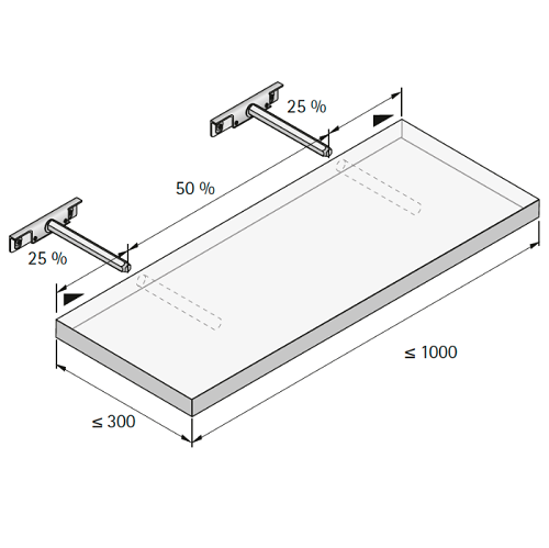 Стелажний полкотримач Titan. Максимальне навантаження з двома Titan, включаючи вагу полиці, становить 9кг. Прихований монтаж за стелажною полицею. Несучий палець: діаметром 12 мм. Регулювання за висотою: ±2 мм. Бокове регулювання за допомогою паза в полиці. Мінімальна товщина полиці: 19 мм. Регулювання нахилу полиці. Артикул: 100 148 1