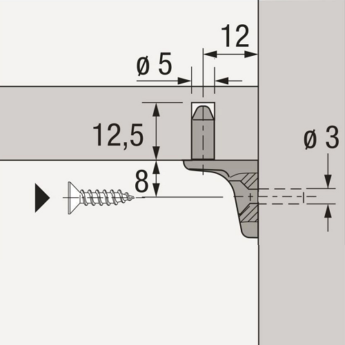 Отвір діаметром 3мм для гвинта прямого кріплення, потайна головка діам.4 мм. Кожен полкоутримувач додатково з цапфою для полиці. Артикул: 100697 7 (79711)