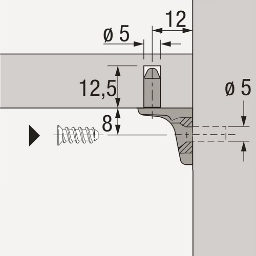 Отвір діаметром 5мм для гвинта прямого кріплення, потайна головка діам.6,3мм. Кожен полкоутримувач додатково з цапфою для полиці. Артикул: 101 102 7 (53012)
