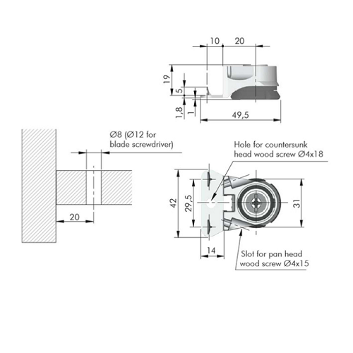 - Встановлюється в торець боковини, широкий модельний та розмірний ряд.