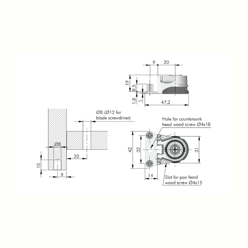 Монтаж: Встановлюється на торець боковини. Оснащена двома штифтами діаметром 8 мм, які фіксуються в попередньо просвердлені отвори в торці.