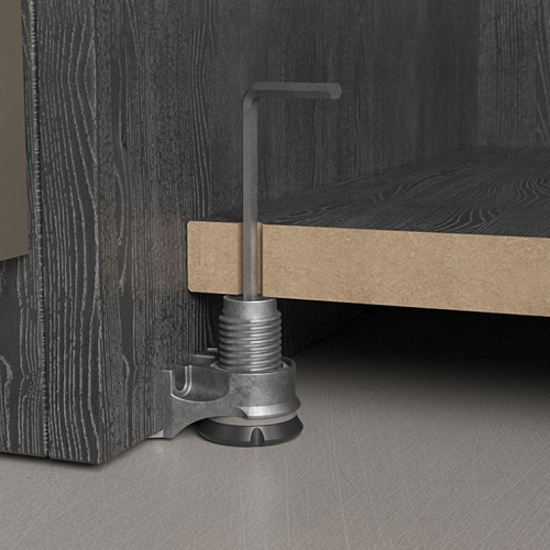 Особливості: Регулювання здійснюється через отвір у дні шафи за допомогою шестигранного ключа, що дозволяє вирівнювати меблі без розвантаження.
