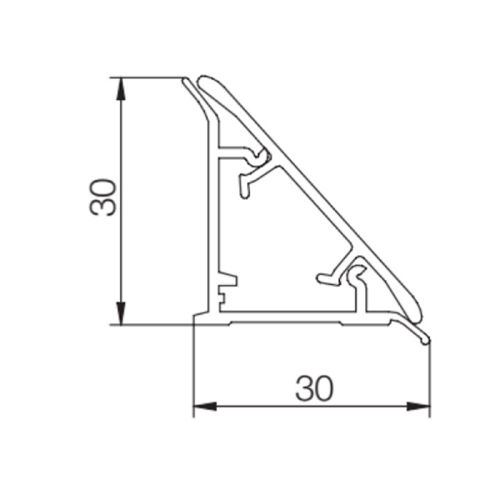 Плінтус трикутний алюмінієвий. Призначена для з'єднання робочої поверхні столу зі стіновим покриттям. Застосування плінтуса покращує зовнішній вигляд кухні, усуває попадання вологи та сміття за робочу поверхню столу. Артикул: M350070601